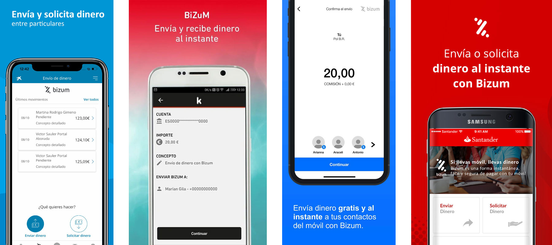 Ejemplos de bancos con Bizum en su aplicación (CaixaBank, Kutxakand, Banco Sabadell y Banco Santander)