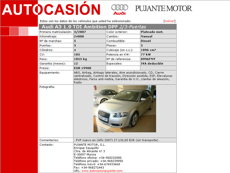 Portal propio. Este es el caso de las webs de ocasión de Huertas Motor o Autos Pujante, que emplean una herramienta idéntica puesta a disposición por Audi, donde se presenta un listado conciso con imágenes de los coches en cartera. Cada oferta ofrece información detallada de kilómetros, año de matriculación, estado, características y extras, así como un álbum de fotografías del interior y exterior del auto. Cualquier información complementaria deberá ser solicitada a través del formulario de contacto, que referencia directamente al auto elegido.