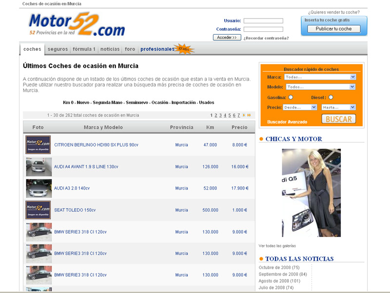 Portales de anuncios sectoriales. Como Autoscout24.com o Motor52 que incorpora oferta multimarca, procedente tanto de particulares como de concesionarios, y que organiza el producto por marca/modelo, kms, año, lugar de venta, tipo de vendedor o combustible, a través de un buscador global. La forma de operar es a través de la inserción de anuncios durante un tiempo, permitiendo agrupar la oferta de un mismo vendedor a partir de su nombre comercial. Como servicios complementarios ofrece también financiación, seguros, análisis comparativos de modelos. Su principal ventaja es la capacidad de atraer potenciales clientes, claramente definidos permitiendo una excelente segmentación, ya que su perfil de usuario corresponde a internautas de entre 34 y 54 años, con mayoría masculina. Están presentes más de medio centenar de empresas de la Región de Murcia.
