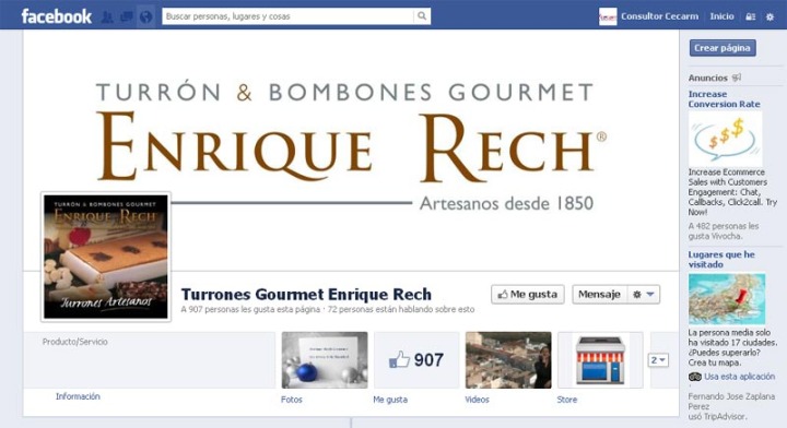En cuanto a redes sociales, Enriquerech.com tiene perfil en Facebook, que gestiona el empresario, donde tienen integrada una tienda online a través de www.social-buy.com. El objetivo es que además de comprar, puedas recomendar los productos a tu red de amigos. Con más de 900 fans, es un canal importante de redireccionamiento de tráfico hacia la tienda online.