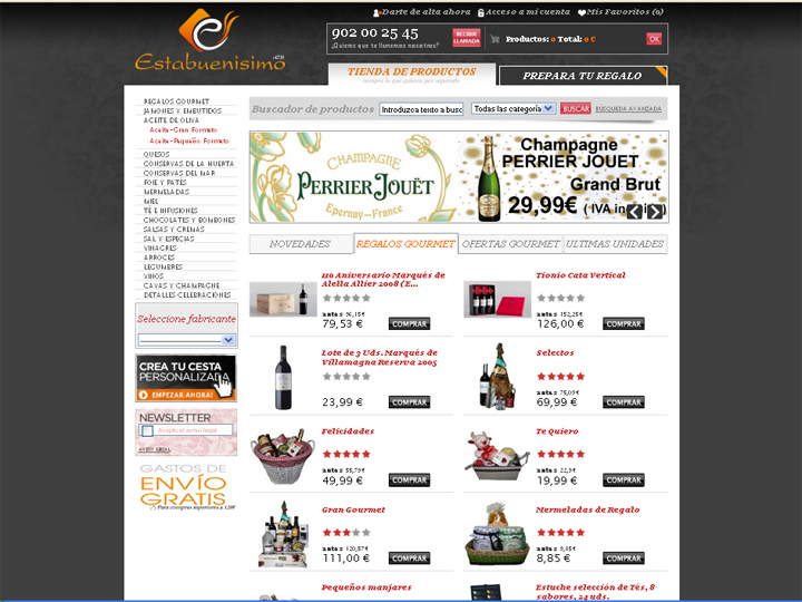 La página home de la tienda ofrece cuatro pestañas destacadas que incluyen Novedades, Regalos Gourmet destacados, Ofertas y Últimas unidades, facilitando así una compra rápida de usuarios poco expertos en el producto. El catálogo, ubicado en el menú lateral, se ofrece agrupado por tipos de productos o por fabricante.