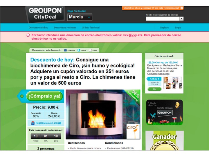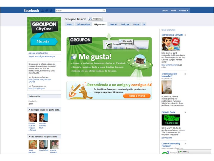 Groupon utiliza principalmente la publicidad en redes sociales para captar usuarios, con una gran incidencia en Facebook, donde además tiene un perfil para Murcia.