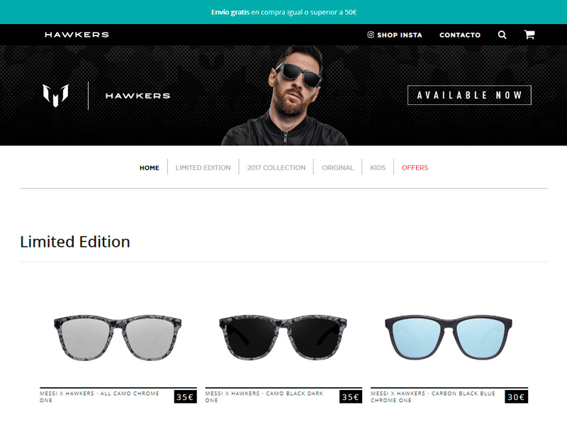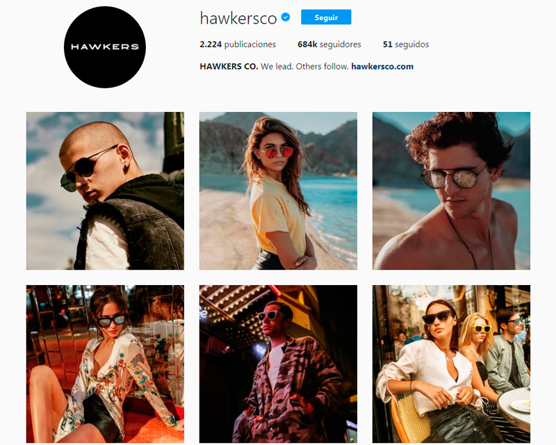 Aunque el trabajo de captación de Hawkers va mucho más allá de su tienda online, un vistazo a ésta muestra una página fresca y actual, con un gran impacto visual y una cuidada estética fotográfica que hace de sus modelos los más deseados del mercado. No en vano, disponen de una poderosa herramienta de ventas a través de imágenes de gente conocida e influencers llevando sus modelos, al más puro estilo de las redes sociales.