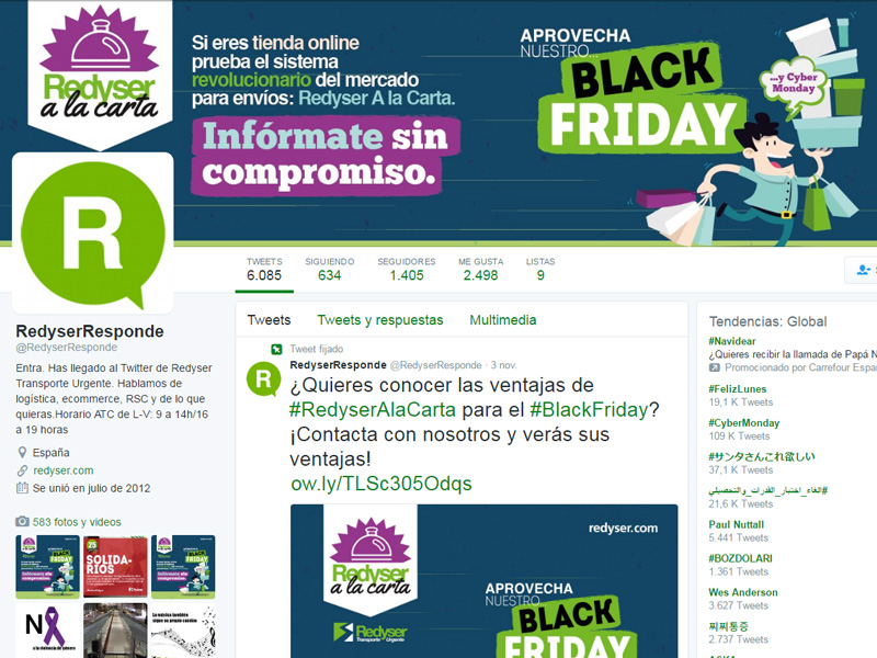 En Twitter@RedyserResponde tiene casi 1.400 seguidores y desde 2012 es un nuevo canal de Atención al Cliente desde el que contesta en pocos minutos a cualquier pregunta sobre logística, e-commerce, RSC y cualquier tema relacionado con la empresa.