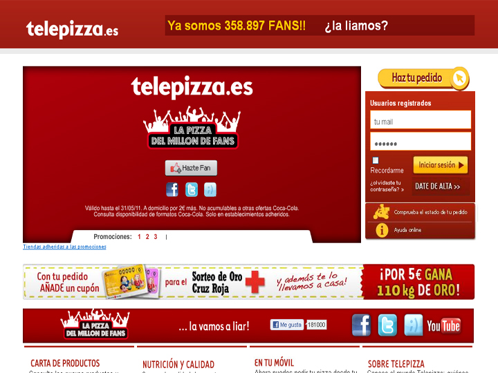 Un ejemplo es la promoción que la empresa ha lanzado recientemente bajo el nombre "La pizza del millón de fans" y el lema "¡Cuando lleguemos al Millón de fans la vamos a liar!" en las redes sociales Facebook, Twitter , Tuenti y Youtube para conseguir aumentar su número de seguidores. El objetivo es llegar al millón de fans (sumando a los seguidores de todas las redes sociales) y que éstos propongan maneras de "liarla" para celebrarlo. En la web de Telepizza hay un contador con el número de fans que van sumando en cada red social y el número de los que faltan para llegar al millón.