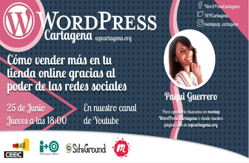 Nueva meetup organizada por la Comunidad de WordPress Cartagena en colaboración con Ceeic, Innovación Óptica y Siteground. Esta vez se hablará de cómo una buena gestión de las redes sociales puede impulsar la visibilidad, y las ventas, de tu tienda o negocio online.