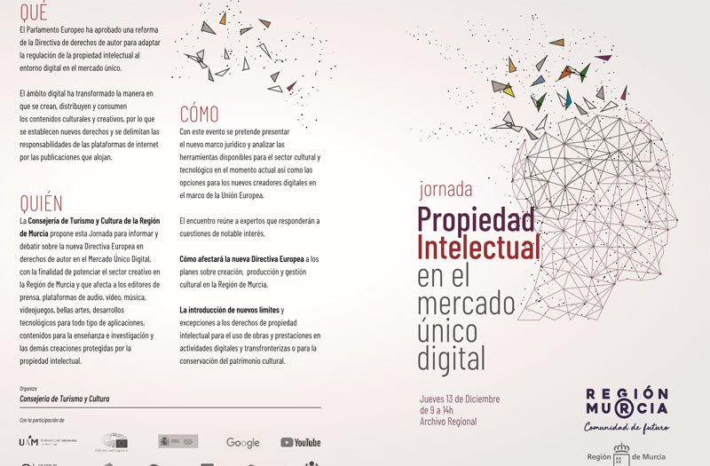 La Consejería de Turismo y Cultura de la Región de Murcia propone esta Jornada para informar y debatir sobre la nueva Directiva Europea en derechos de autor en el Mercado Único Digital, con la finalidad de potenciar el sector creativo en la Región de Murcia y que afecta a los editores de prensa, plataformas de audio, video, música, videojuegos, bellas artes, desarrollos tecnológicos para todo tipo de aplicaciones, contenidos de la enseñanza e investigación y las demás creaciones protegidas por la propiedad intelectual.