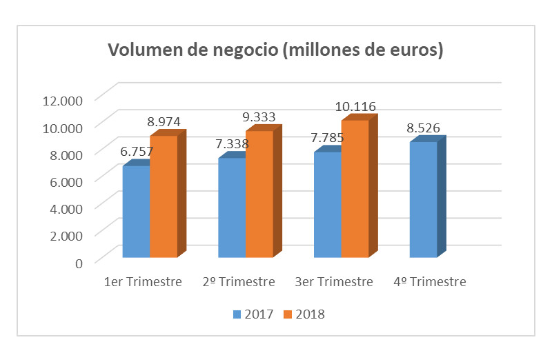 El volumen de negocio de las transacciones con origen en España y dirigidas hacia el exterior ha sido de 4.787 millones de euros, un 36,8 % más que en el tercer trimestre del año anterior.