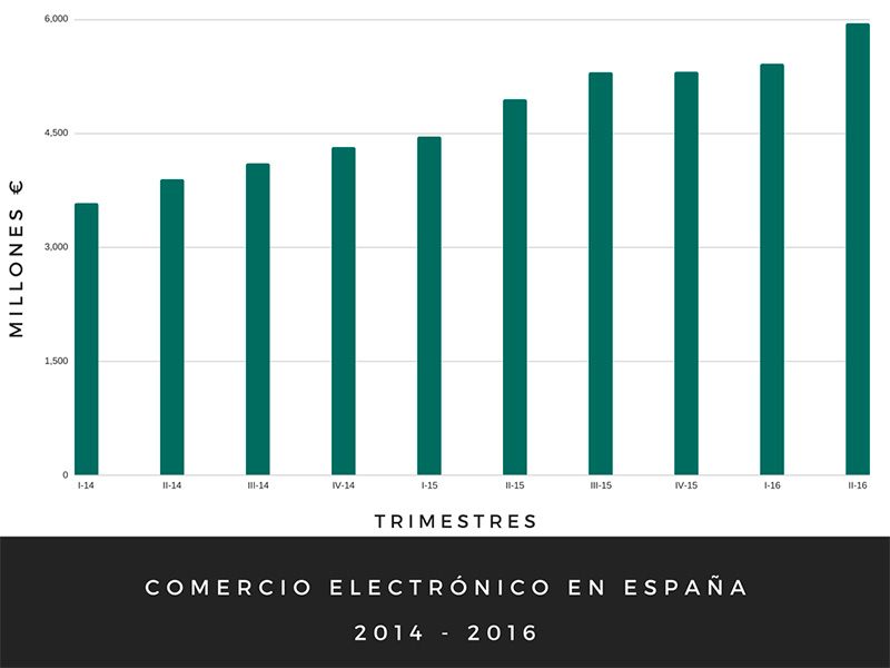 Ayer miércoles 4 de enero, la Comisión Nacional de los Mercados y la Competencia (CNMC) ha publicado los datos del volumen de negocio del comercio electrónico en España correspondientes al segundo trimestre de 2016, reflejando una subida del 20,3% interanual, llegando a los 5.948 millones de euros.