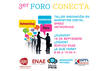 La III edición del Foro Conecta, organizado por AJE Región de Murcia en colaboración con ENAE y CIMM, tendrá lugar el próximo 18 de septiembre en horario de mañana en la Escuela de Negocios ENAE.