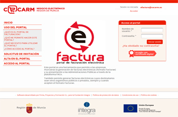 La Consejería de Desarrollo Económico, Turismo y Empleo, a través de la Fundación Integra, ha puesto en marcha un servicio online de facturación electrónica, integrado en el portal de Comercio Electrónico Cecarm, que permite a las pymes y emprendedores validar y generar facturas electrónicas que cumplan con todos los requisitos legales. En concreto permite a las empresas murcianas la generación de las facturas electrónicas (formato Facturae) y su presentación a cualquier administración pública a través de la plataforma ‘FACe’, es decir, el punto de entrada de facturas electrónicas de la Administración nacional a las que se ha adherido la Región de Murcia.