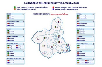 El proyecto Cecarm (www.cecarm.com) tiene por objeto potenciar el desarrollo del negocio electrónico en la Región de Murcia. Una de sus acciones fundamentales consiste en llevar a cabo diversos talleres formativos sobre el tema. Este año se han previsto 35 talleres que recorrerán un total de 14 municipios de la Región durante los meses de mayo, junio, septiembre, octubre y noviembre.