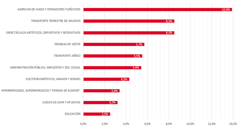 Otro trimestre más, el sector turístico, con las agencias de viajes, operadores turísticos y transporte aéreo, lidera la facturación. Le siguen en volumen de negocio las prendas de vestir, los juegos de azar y apuestas, hoteles y alojamientos similares, y los espectáculos artísticos, deportivos y recreativos.