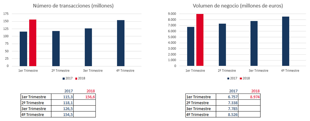 El pasado 5 de octubre la Comisión Nacional de los Mercados y la Competencia (CNMC) publicada los primeros resultados trimestrales correspondientes al presente año. Los datos del primer trimestre de 2018 arrojan un crecimiento del 32,8 % respecto al año anterior, con una facturación de 8.974 millones de euros y más de 156 millones de transacciones registradas. La tendencia del sector sigue siendo de crecimiento, registrando en este periodo la mayor tasa de variación interanual desde 2013 cuando se comenzaron a registran los datos trimestrales de este sector.