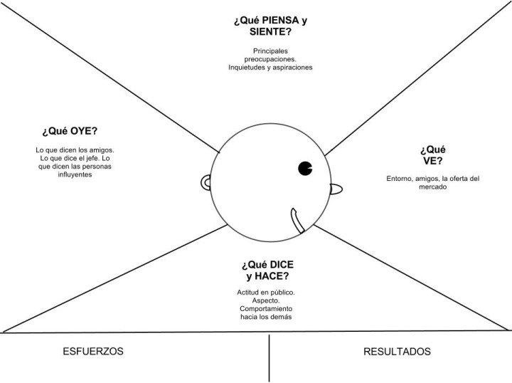 Debemos conocer qué piensa y qué siente nuestro cliente, descubrir las principales preocupaciones o aspiraciones; qué ve, calificar el entorno, los amigos y las ofertas de mercado; qué oye, distinguir lo que dicen los amigos, el jefe, y los “influencer”; saber qué dice y hace, la actitud en público, el aspecto, el comportamiento hacia los demás; conocer qué les frustra y qué les motiva. De esta forma, podremos ajustar nuestra propia propuesta de valor a las aspiraciones, frustraciones y necesidades reales de los clientes. La forma apropiada de hacer un buen Mapa de Empatía es segmentando primeramente a los clientes por grupo para saber los grupos sobre los que nos interesa trabajar. Además, debemos humanizar a una persona de cada segmento, poner cara, nombre, ciudad, etc. Debemos empatizar con él, con el simple objetivo de conocer mejor a nuestro cliente y sobre todo salir a la calle y validar todas las hipótesis que hemos ido construyendo de su entorno.