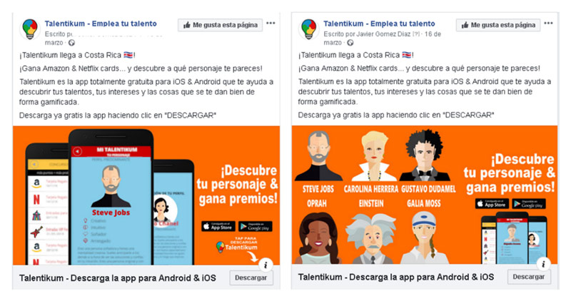 Averiguar las creatividades que mejor funcionan con nuestro target de clientes y utilizarlas en nuestra web, en folletos comerciales, etc. En la imagen siguiente vemos dos variantes de anuncio donde la creatividad de la derecha obtuvo más conversiones que la original. Por tanto, en los mensajes de la web se optaría por hacer más hincapié en el carrusel de personajes disponibles más que en las prestaciones de la propia app.