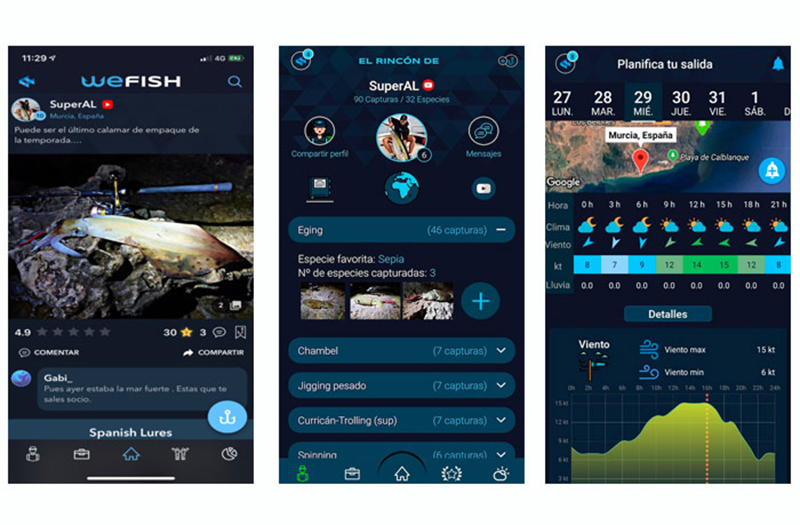 Un caso de App de reciente creación murciana es Wefish, una aplicación de pesca gratuita que, como ellos mismos definen, es un diario de pesca “sencillo, interactivo, social y confidencial. Una aplicación de móvil desarrollada por pescadores, para pescadores”. Desde la App se obtienen estadísticas personales, construyéndose de forma atractiva, el perfil del pescador. Además, posee un cuidado diseño de interface, que garantiza una experiencia de usuario totalmente satisfactoria.