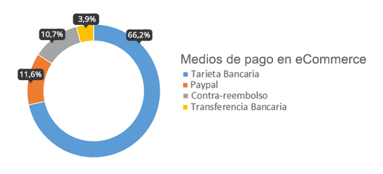 Según el Observatorio Nacional de las Telecomunicaciones, la tarjeta bancaria sigue siendo el medio preferido para cerrar transacciones, con un 66,2% de usuarios, seguido de Paypal (11,6%), el pago contra-reembolso (10,7%) y, en último lugar, el pago mediante transferencia bancaria (3,9%).