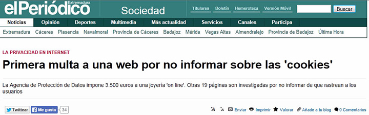 Noticia sobre la primera multa por incumplir la Ley de Cookies.