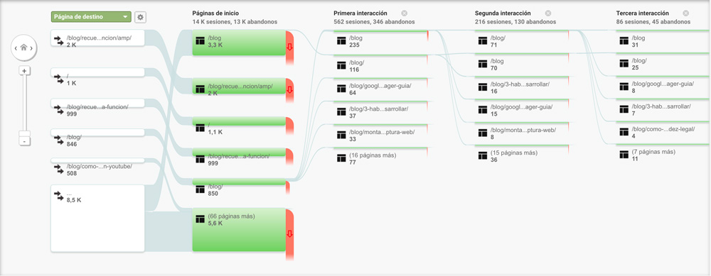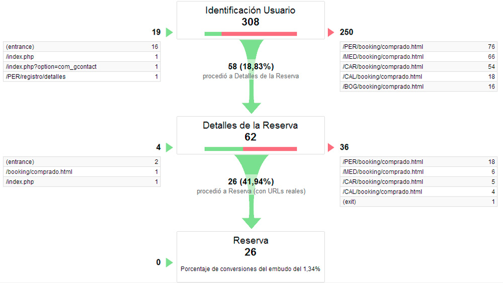 Ahora bien, ¿cuál es la razón de la pérdida de usuarios? ¿No deberíamos tratar de convertir ese embudo en un cilindro? Ahí es donde el informe de embudos de conversión de Analytics obra su magia, ya que nos permite conocer qué pasos del embudo son más o menos eficientes y hacia dónde van los usuarios que abandonan un determinado paso.