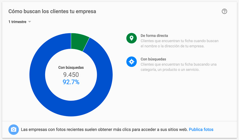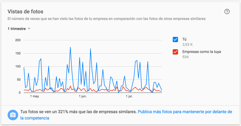 Las empresas con más fotos obtienen mayor ratio de impresiones y clics. Google te lo advierte en las estadísticas, como se puede ver en esta imagen: