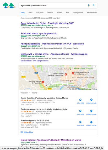 En Google, cuando una persona realiza una búsqueda con carácter geolocalizada de un negocio, producto o servicio, además de los resultados de pago (Adwords) y los orgánicos, se le muestra un resumen de los resultados de Mapas (ubicaciones físicas de empresas).