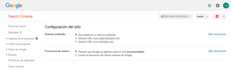 Es lo primero que debemos hacer para no incurrir en errores de duplicidad de contenido. Inscribiremos la web no sólo con “www” sino también sin “www”. Para ello, en el icono de configuración, en la opción “Preferencias del sitio”, debemos establecer qué dominio vamos a utilizar como predeterminado. Si el dominio también tuviese “https” hay que incluir todas las versiones de la url.