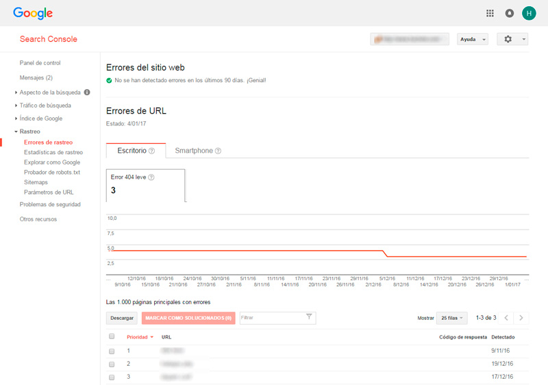 Monitorizar los errores de rastreo es primordial si no queremos tener una serie de páginas en nuestra web en las que al entrar nos aparezca un error, ya sea 404 (página no encontrada) o error 50X (error de servidor).