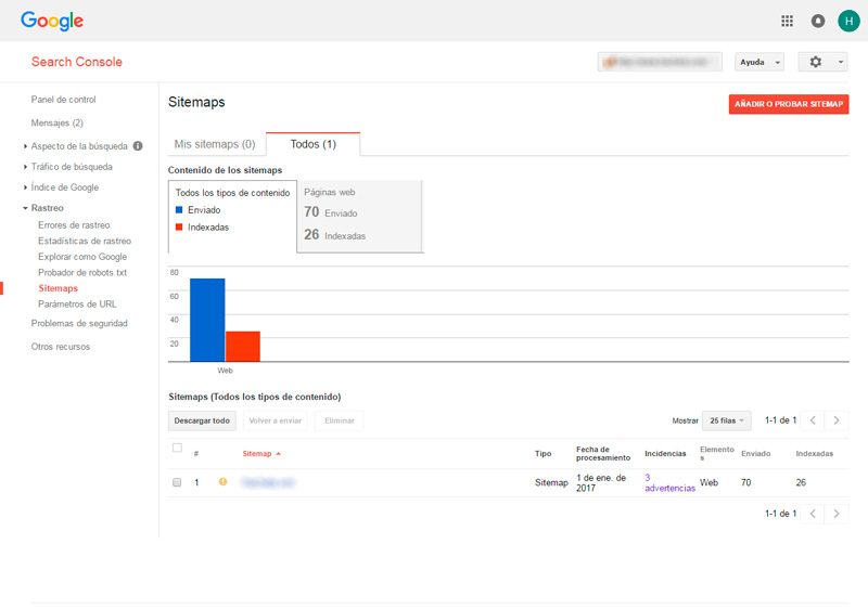 Enviar un archivo XML denominado sitemap o mapa del sitio web es primordial también para decirle a Google no sólo el tipo de estructura que tiene nuestra página, sino la cadencia de actualización de cada página y las páginas a indexar. Search Console identificará en el sitemap las direcciones URL enviadas, indexadas y las imágenes. El sitemap no es garantía de que todos los elementos que estén en el sitemap vayan a ser rastreados e indexados, ya que Google utiliza unos procesos basados en algoritmos bastante complejos. No obstante, casi siempre, tu sitio web se beneficiará de usar un sitemap y de ninguna anera le penalizará o será perjudicado.