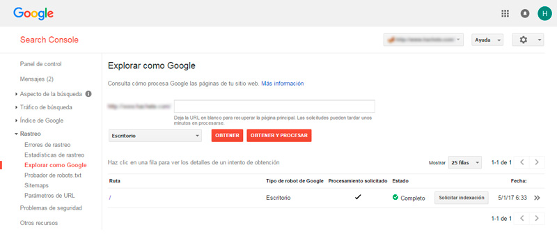 Si queremos saber cómo ve Google nuestra página web debemos hacerlo en esta sección. Entramos mediante una dirección URL y vemos la información a su manera. Esto también lo haremos cuando queremos forzar la indexación de alguna página de un sitio web.