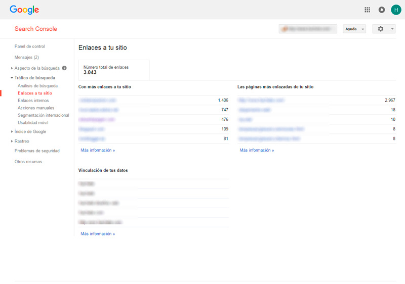 En Search Console podemos visualizar el número de enlaces que tenemos apuntando a todas las direcciones URL de nuestro dominio. De esta forma, podremos visualizar si hay un crecimiento desmesurado de enlaces de baja calidad que podría llevarnos a tener una penalización en nuestra página web.