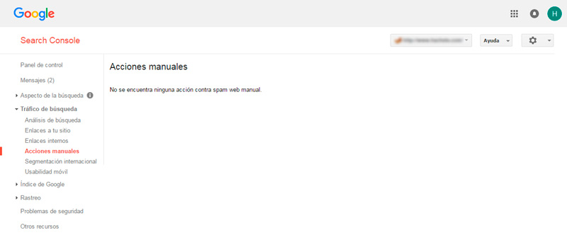 Si Google va a establecer una penalización manual, notificará al webmaster de la página en esta sección. Lo habitual es encontrarte: “No se encuentra ninguna acción contra spam web manual”. Si por el contrario vemos que hay algún tipo de notificación, deberemos reparar nuestra web de inmediato y reportar la incidencia como solucionada.