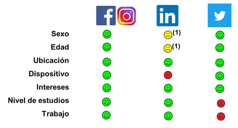 Criterios de segmentación disponibles para cada red social. (1) segmentación no exacta, sino inferida