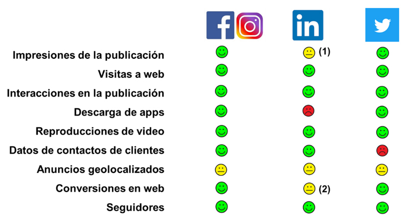 En el siguiente gráfico presentamos un resumen de distintos tipos de objetivos según la red social en la que vayamos a anunciarnos. Si, por ejemplo, nos interesa conseguir leads de clientes (datos de contacto, email, teléfono, …) no podremos usar Twitter para dicho objetivo de forma directa, pues dicha opción no está disponible. En ese caso, debemos usar como objetivo “Visitas a nuestra web” para allí conseguir el lead de contacto.