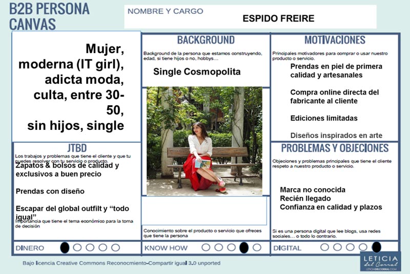 La mejor forma es construir el buyer persona a través de las múltiples herramientas disponibles (en este artículo de CECARM las comentamos con más detalle). El siguiente ejemplo ilustra un buyer persona usando el modelo de Letizia del Corral.