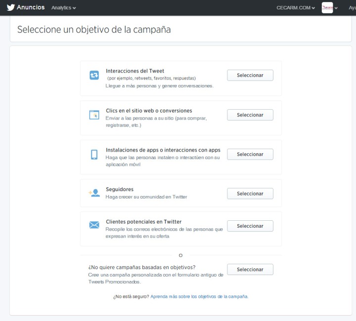 Ahora mismo podemos realizar 6 tipos diferentes de campañas, según su objetivo, en Twitter Ads. Son las siguientes:
