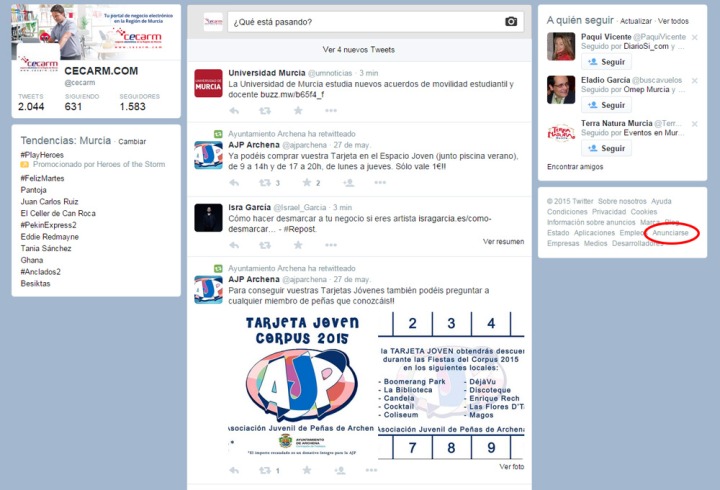 Entramos a nuestro perfil de Twitter, en la sección de inicio. Seguidamente hay que pinchar en la columna de la derecha, en el apartado “Anunciarse”, para así poder entrar en la plataforma de Twitter Ads.