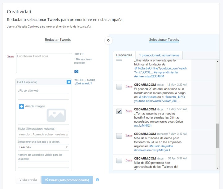 Si nos decidimos por redactarlo, tenemos que completar el texto, teniendo como máximo los famosos 140 caracteres. Se puede comprobar qué tal nos está quedando el tuit a través del botón “vista previa”. Así, comprobaremos cómo se verá tanto en soporte escritorio (Pc o Mac) como en iOS y Android. Podemos redactar más de uno para utilizarlo durante la campaña de forma simultánea.