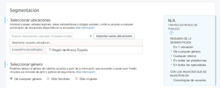 El primer factor de segmentación que nos encontramos es por ubicación. Podemos hacer que nuestro tuit sólo se vea en determinados lugares, en un conjunto de ellos, o por el contrario podemos decidir que se muestre en todas las ubicaciones. Es importante segmentar por ubicación para conseguir llegar al público objetivo que queremos.