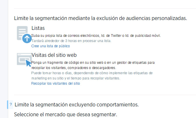 Algo que puede llegar a ser realmente interesante es que el tuit sólo le aparezca a unos determinados usuarios que previamente hayamos importado, o mediante un código insertado en nuestra web, a modo de remarketing. En esta última opción, la campaña le aparecerá sólo a los usuarios que hayan visitado nuestra página web y no sean seguidores. También podemos utilizar esta opción para evitar que a los usuarios que visitaron nuestra web les aparezcan los anuncios.