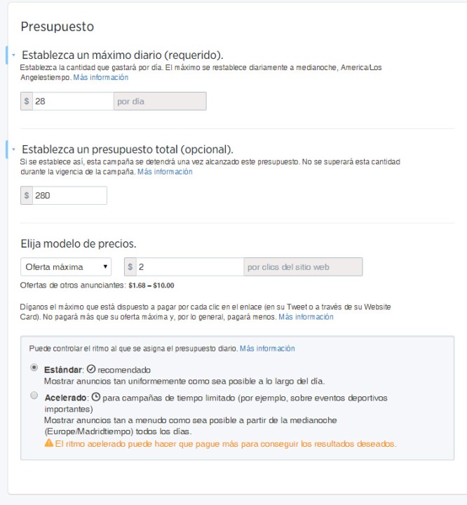 Y por último, en el proceso de segmentación y configuración inicial, deberemos establecer el presupuesto para nuestra campaña. En este apartado podemos decidir el máximo diario a invertir y establecer un límite de gasto total mensual. Además, también es posible establecer la oferta máxima o personalizada para cada tuit y elegir cómo queremos que aparezca: de forma estándar (lineal) o de forma acelerada (mostrar los anuncios muy seguidos).