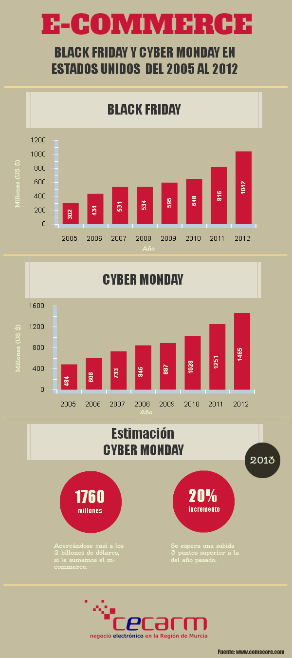 El Black Friday era un evento principalmente offline, pero últimamente, como todo el comercio en general, tiene su versión online. Si bien es cierto que es el lunes siguiente cuando se produce el mayor evento en ventas online de Estados Unidos, conocido como el Cyber Monday, y que tiene incluso más repercusión en las ventas, tal y como podemos ver en la siguiente infografía.