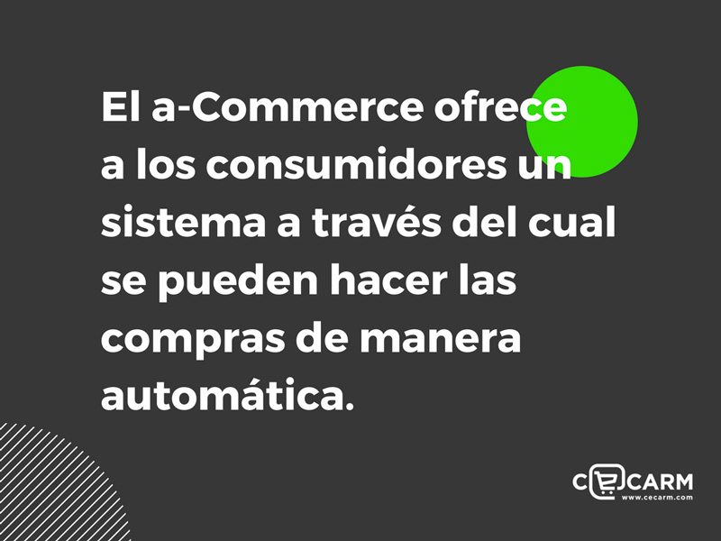 El a-Commerce ofrece a los consumidores un sistema a través del cual se pueden hacer las compras de manera automática, es la posibilidad de programar las compras y casi predecirlas, según los patrones de consumo detectados.
