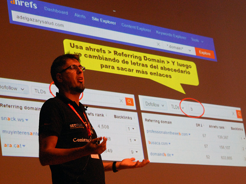 Seguidamente llegaría el turno para Javier Gosende. Javier también formaba parte del grupo de los Grey Hat, y en este caso se subía al escenario de SEOPLUS para hablar de Enlaces y linkbuilding.