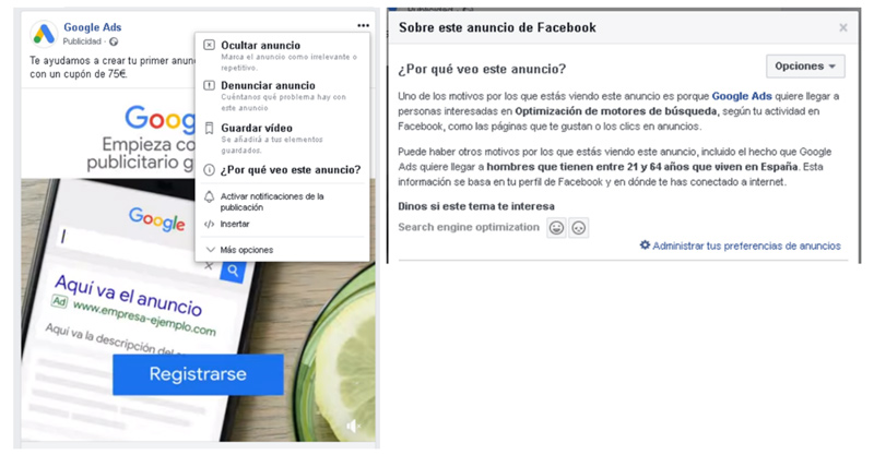 Igualmente, podemos utilizar la opción “¿Por qué veo este anuncio?” para hacernos una idea del buyer persona que nuestra competencia está usando en los anuncios que tiene puestos en circulación.