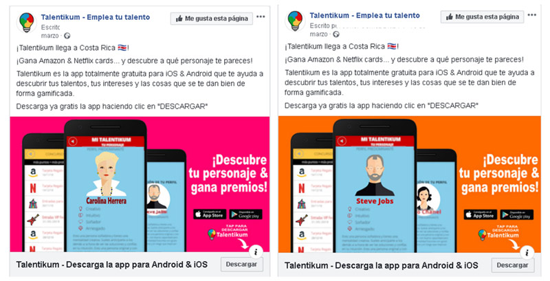 Averiguar las creatividades que mejor funcionan con nuestro target de clientes y utilizarlas en nuestra web, en folletos comerciales, etc. En la imagen siguiente vemos dos variantes de anuncio donde la creatividad de la derecha obtuvo más conversiones que la original. Por tanto, en los mensajes de la web se optaría por hacer más hincapié en el carrusel de personajes disponibles más que en las prestaciones de la propia app.