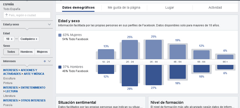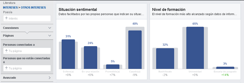 En el ejemplo siguiente, introducimos una serie de intereses genéricos y la plataforma nos indica en qué porcentaje se segmenta por sexo, edad, estado civil y nivel educativo, tipo de dispositivo usado, actividad dentro de Facebook, etc.