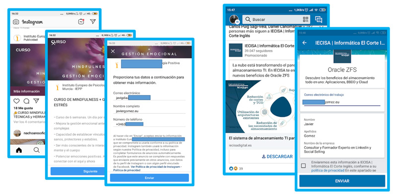 Ejemplos de anuncios en los que se captura el lead directamente desde el mismo anuncio, nada más que con la promesa de la propuesta de venta