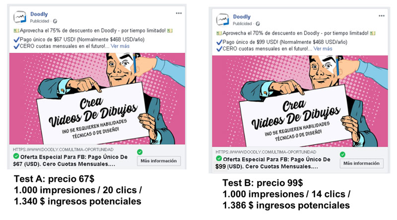 En este sentido, los anuncios de Facebook pueden sernos de gran ayuda, ya que podemos lanzar a al mismo tiempo dos anuncios donde la única variante es el precio y comprobar resultados, es decir, medir la elasticidad de la demanda. En el ejemplo que mostramos a continuación, comprobamos como, pese a incrementar el precio casi un 50% con su respectivo descenso en la cantidad demanda, los ingresos totales son superiores.